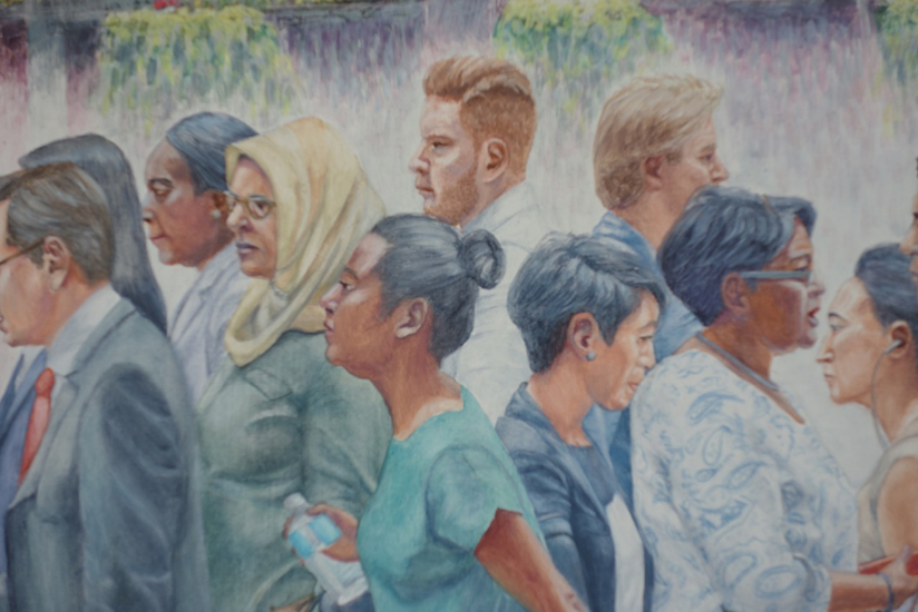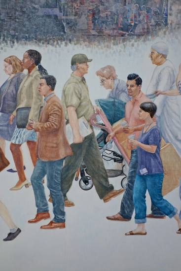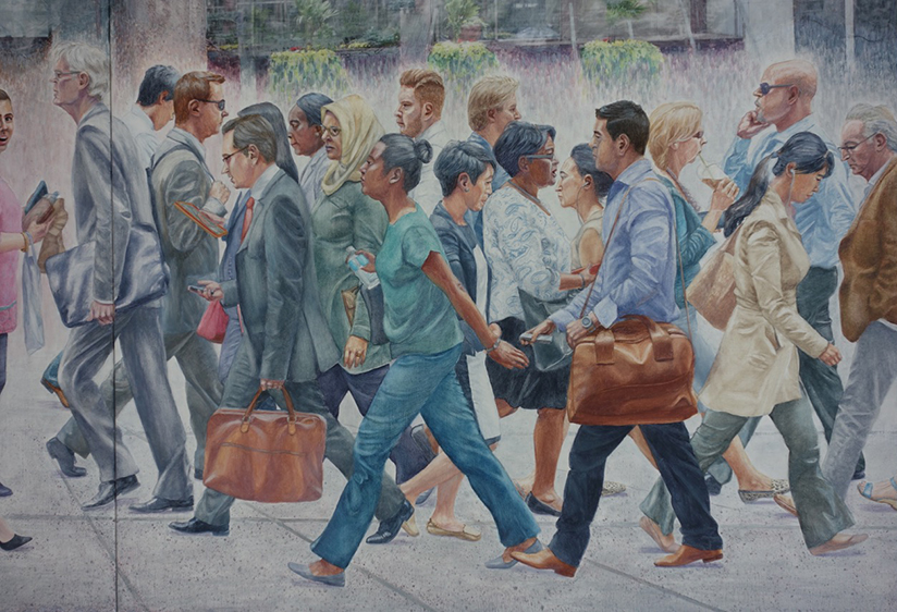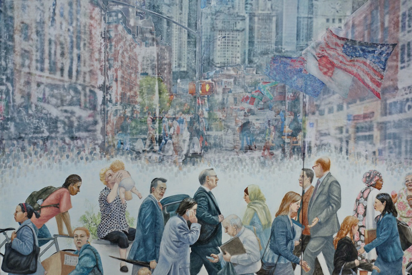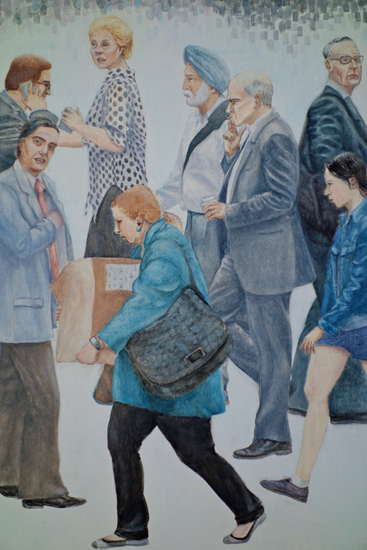 This is set in a nameless city. It could be anywhere, as suggested by the various flags. People rush to and fro. However, if you look closely, you will see some people repeated, at first rushing like the others, then having their attention caught, then taking, or about to take, a moment to enjoy. I have included people of different ages and ethnicities to indicate the universality of this phenomenon.