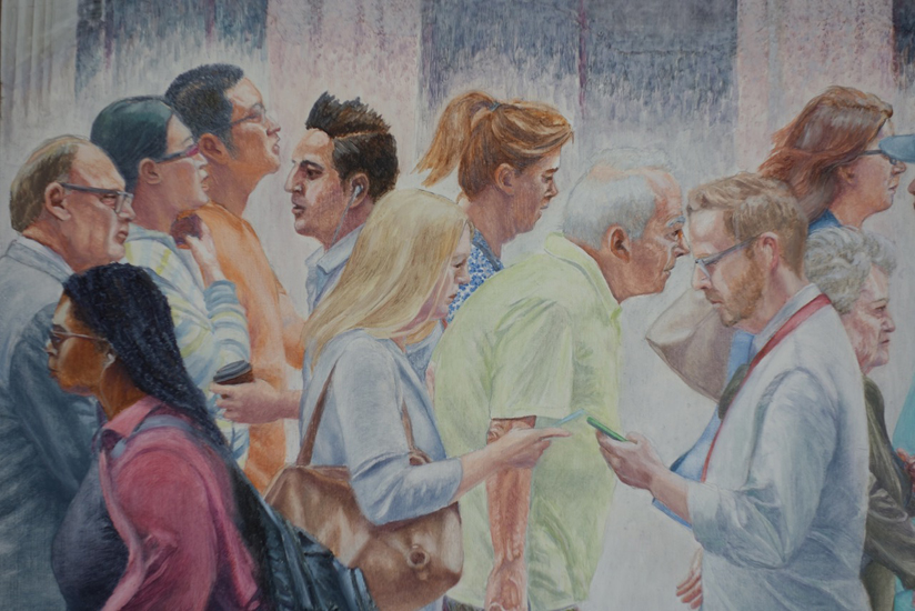 All the people in this painting are preoccupied, their focus inward. There is only one exception. Perhaps it is us she notices. This is about the need to stop and enjoy the small moments of life.